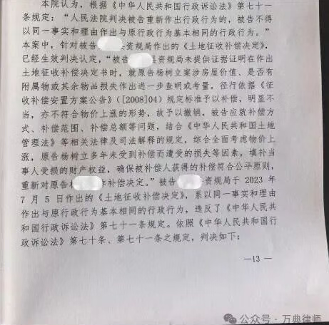 针对资规局所作补偿决定,人民法院在判决书中进行警告和批判,内容如下:“”之前的生效判决已经认定,“被告xx县资规局未提供证据证明在作出土地征收补偿决定书时,就原告杨xx案涉房屋价值、是否有附属物或其余物品损失作出进一步查明或考量,径行依据《征收补偿安置方案公告》([2008]04)规定标准予以补偿,明显不当,亦不符合物价上涨的形势,故予以撤销,被告应就补偿方式、补偿范围、补偿总额等问题,结合《中华人民共和国土地管理法》等相关法律及司法解释的规定,综合全面考虑物价上涨,原告杨xx多年未受到补偿而遭受的损失等因素,填补当事人受损的财产权益,确保被补偿人获得的补偿符合公平原则,重新对原告杨xx作补偿决定。”被告xx县资规局于2023年7月5日作出的《土地征收补偿决定》,系以同一事实和理由作出与原行政行为基本相同的行政行为,违反了《中华人民共和国行政诉讼法》第七十一条规定。故判决撤销被告第二次作出的征收补偿决定。”