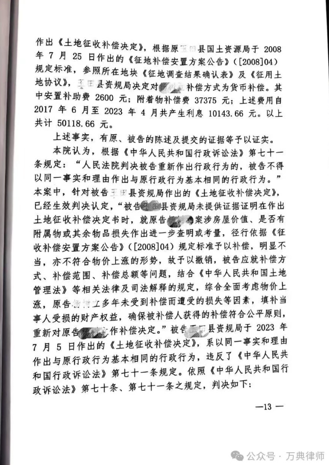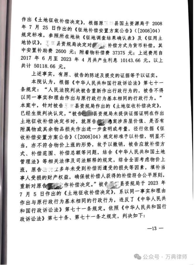 7,资规局再次作出补偿决定,决定当仅仅补偿50118.66元,人民法院判决撤销,并且在判决书中作出警告。